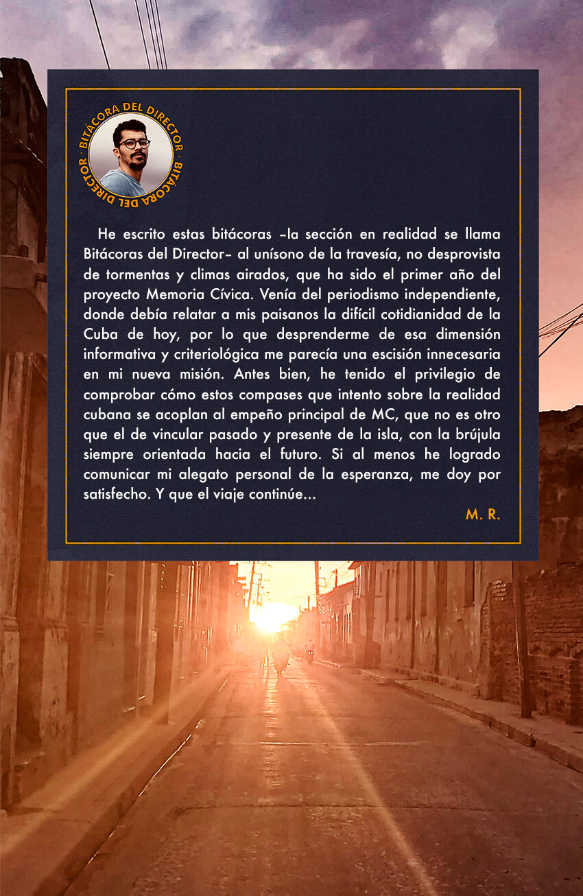 He escrito estas bitácoras ⸺la sección en realidad se llama Bitácoras del Director⸺ al unísono de la travesía, no desprovista de tormentas y climas airados, que ha sido el primer año del proyecto Memoria Cívica. Venía del periodismo independiente, donde debía relatar a mis paisanos la difícil cotidianidad de la Cuba de hoy, por lo que desprenderme de esa dimensión informativa y criteriológica me parecía una escisión innecesaria en mi nueva misión. Antes bien, he tenido el privilegio de comprobar cómo estos compases que intento sobre la realidad cubana se acoplan al empeño principal de MC, que no es otro que el de vincular pasado y presente de la isla, con la brújula siempre orientada hacia el futuro. Si al menos he logrado comunicar mi alegato personal de la esperanza, me doy por satisfecho. Y que el viaje continúe…