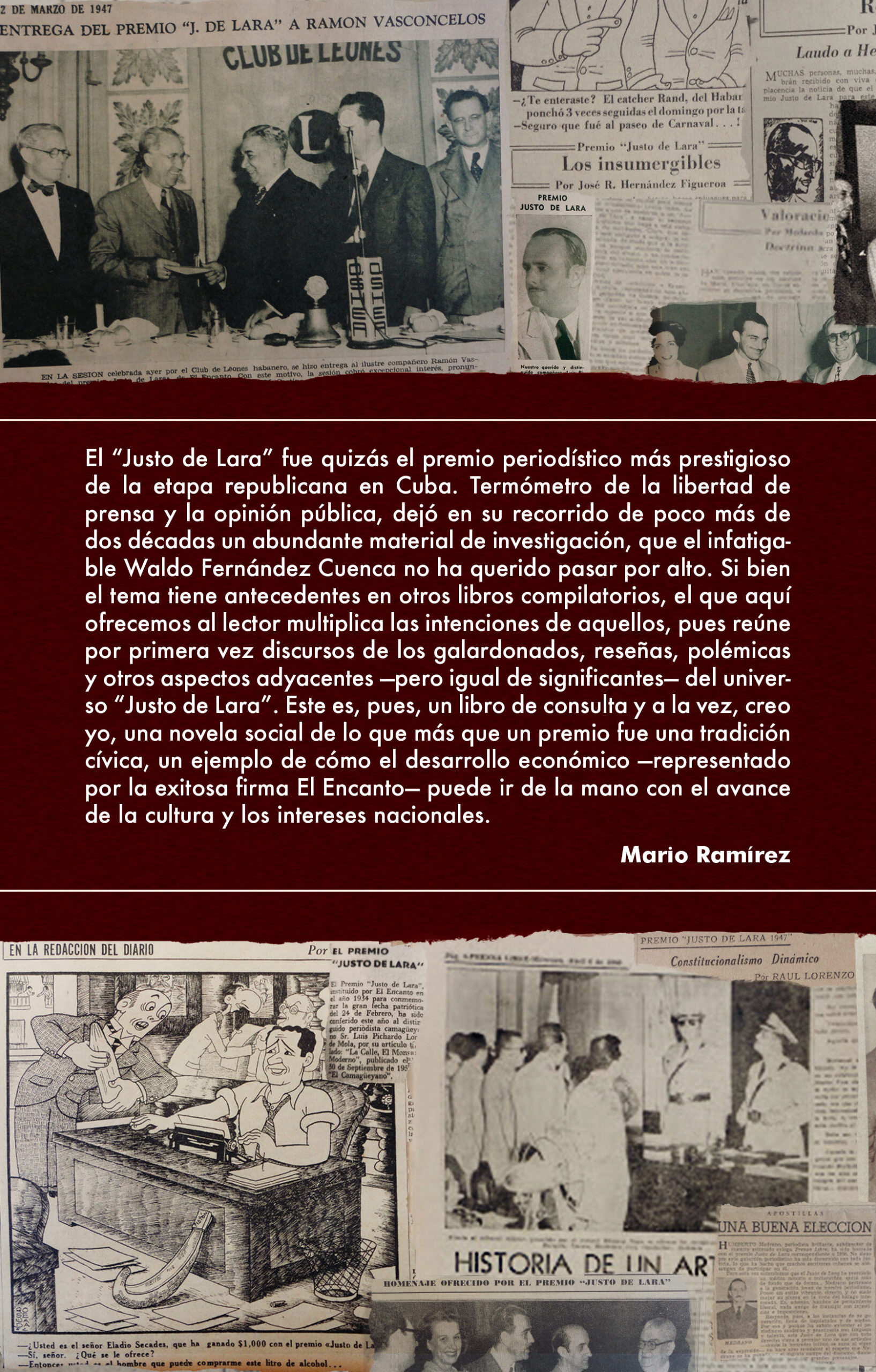 El “Justo de Lara” fue quizás el premio periodístico más prestigioso de la etapa republicana en Cuba. Termómetro de la libertad de prensa y la opinión pública, dejó en su recorrido de poco más de dos décadas un abundante material de investigación, que el infatigable Waldo Fernández Cuenca no ha querido pasar por alto. Si bien el tema tiene antecedentes en otros libros compilatorios, el que aquí ofrecemos al lector multiplica las intenciones de aquellos, pues reúne por primera vez discursos de los galardonados, reseñas, polémicas y otros aspectos adyacentes ⸺pero igual de significantes⸺ del universo “Justo de Lara”. Este es, pues, un libro de consulta y a la vez, creo yo, una novela social de lo que más que un premio fue una tradición cívica, un ejemplo de cómo el desarrollo económico ⸺representado por la exitosa firma El Encanto⸺ puede ir de la mano con el avance de la cultura y los intereses nacionales.