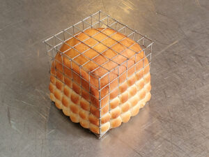 Fotografía de la obra “Algo vivo dentro de algo muerto” (masa de pan leudada y horneada dentro de jaula metálica), de Nelson Jalil (tomada de Hypermedia Magazine).