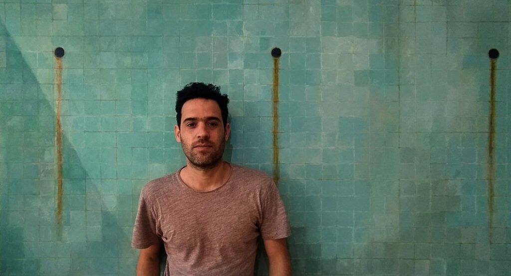 El artista Nelson Jalil con una «escena» de la serie El país de las piscinas vacías (cortesía del entrevistado).